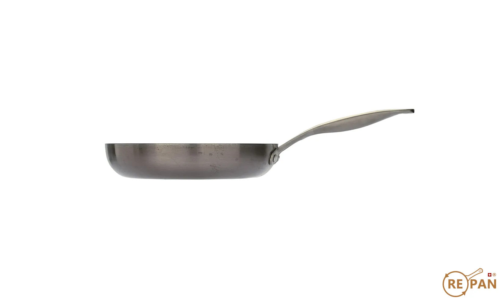 Robuste genietete Bratpfanne. Die Originalpfannen werden in Belgien von eigenen Produktdesignern entworfen und in China produziert, getestet und gefertigt. RePan wertet die Pfannen auf mit der preisgekürten keramikverstärkten Anti-Haft Beschichtung und erhält das bewährte Design.