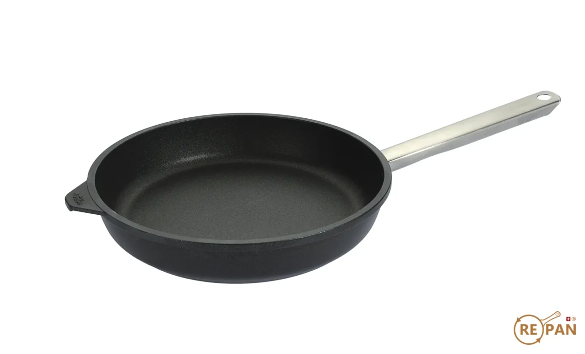 Woll Aluminiumguss Pfanne mit deutscher Qualität. Das relativ hohe Gewicht zu anderen Marken verleiht der Pfanne eine sehr gute Wärmeleitung und -Speicherung. RePan beschichtet neu mit einer noch besseren keramikverstärkten Anti-Haftbeschichtung als neu.